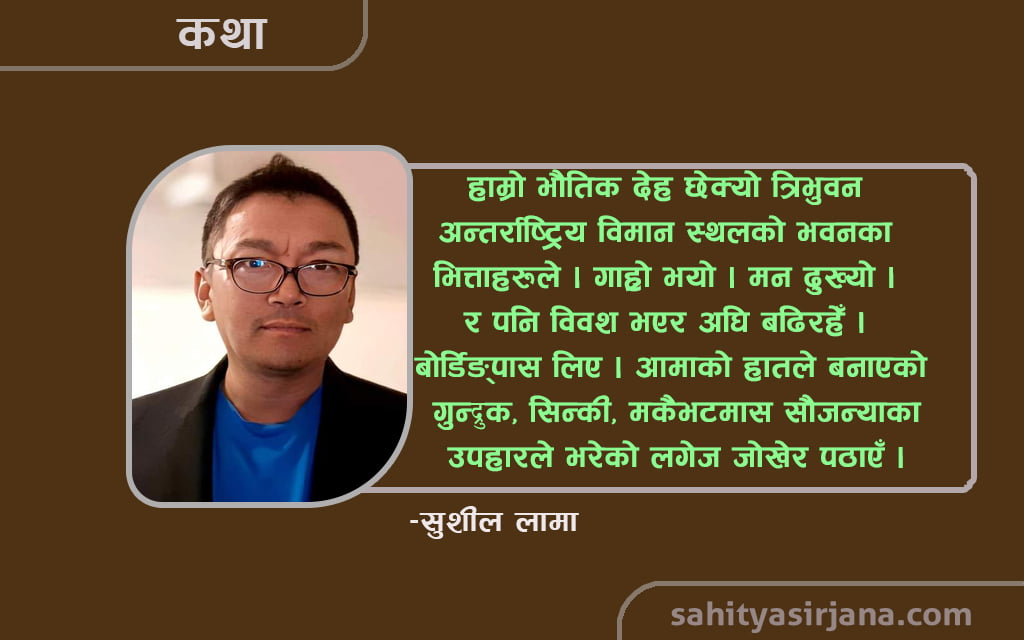 हाम्रो भौतिक देह छेक्यो त्रिभुवन अन्तर्राष्ट्रिय विमान स्थलको भवनका भित्ताहरूले । गाह्रो भयो । मन दुख्यो । र पनि विवश भएर अघि बढिरहेँ । बोर्डिङ्पास लिए । आमाको हातले बनाएको गुन्द्रुक, सिन्की, मकैभटमास सौजन्याका उपहारले भरेको लगेज जोखेर पठाएँ ।