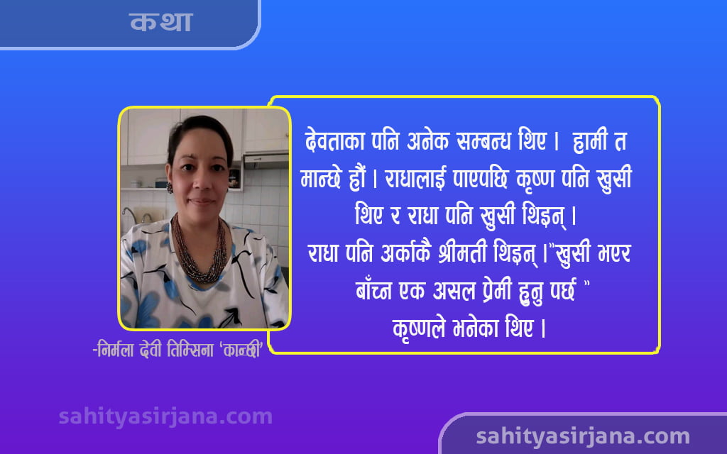 मेरा अनेक सवालमा उनको एउटै जबाफ थियो ” छाडा “। मैले उनलाई सम्झाउँदै भनें ” मन पराउनु ,प्रेम हुनु र माया गर्नु छाडा हुनु नै हो । असल प्रेमी बीच कुनै कुरा लुक्दैन र लुकाउन पनि मिल्दैन । यदि कुरा लुक्यो भने त्यहाँ प्रेम नभएर सम्झौता हुन सक्छ । देवताका पनि अनेक सम्बन्ध थिए ।हामी त मान्छे हौं । राधालाई पाएपछि कृष्ण पनि खुसी थिए र राधा पनि खुसी थिइन् । राधा पनि अर्काकै श्रीमती थिइन् ।”खुसी भएर बाँच्न एक असल प्रेमी हुनु पर्छ “कृष्णले भनेका थिए ।मलाई थाहा छ ,तिमीलाई पनि मेरो माया लागिसकेको छ । तिम्रो र मेरो प्रेम बीच कुनै तगारो आउन दिन्न ।हाम्रो प्रेम सुरक्षित हुनेछ । यसले कसैलाई हानि हुने छैन । मसँग प्रेम सम्बन्धमा रहेर तिम्रो श्रीमानलाई धोका देऊ म भन्दिनँ । म पनि मेरी श्रीमतीलाई धोका दिन्न । हामी हाम्रो घर बिगारेर विवाह गर्ने सर्तमा हैन गोप्य सम्बन्धमा रहने छौँ। तिमीसँग प्रेम भयो यो सत्य हो । कृपया मेरो प्रेमलाई स्वीकार गर । हामी प्राविधिक सम्बन्धमा हुनेछौं । कहिले भेटिन्छ थाहा छैन । मैले तिमीलाई अधिक मन पराएँ र माया गरेँ। मेरी आमा मेरो लागि भगवान हुन् । म आमाको कसम खाएर भन्छु । म तिमीलाई बर्बाद हुन दिन्न ।”