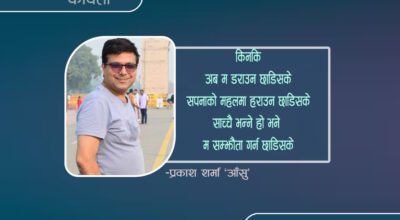 -प्रकाश शर्मा ‘आँसु’ मौनतालाई कमजोरी ठान्नेहरू मेहनतलाई मजबुरी ठान्नेहरू नरम बोली लाई चाकरी ठान्नेहरू सम्मानलाई लाचारी ठान्नेहरू होस् गरी बस …… तिम्रा अतिवादी , अत्याचारी ,दमनकारी सनयन्त्रकरी ,विबेधकरी , निषेधकारी