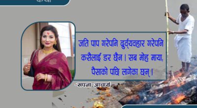 -सपना आचार्य करिब ३ घण्टासम्म चिता जलिरहेको स्थानमा बसेर हेरिरहेँ । कोही रोइरहेका थिए । कोही सहानुभूति दिँदै थिए । कुनै असल मान्छे थिए बिचरा भन्दै थिए । त कुनै