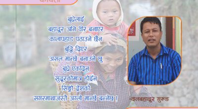 -दलबहादुर गुरुङ उचालेर सुदूरपश्चिमको सन्तान सुदूरपूर्वकाे सगरमाथा चुमाउने रहर छ छाउपडीबाट जाेगिएर जन्माएकाे छाउराे हाे ! उमारेकाे हुँ पाठेघरमा हुर्काएकाे हुँ बच्चादानीमा उसलाई जन्माउन हजारपटक मरेकी छु उसलाई बचाउन घामपानी,हूरिबतास