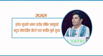 -सुशील सापकोटा खुसी आँसु अस्थिर छन् सधैँ एउटै बात रहन्न आउँछ बिहान पर्ख एक छिन स्थिर यो रात रहन्न निराशाको यात्रा पुग्छ उमङ्गको गन्तव्यमा फेरि आउँछ अन्धकार एकोहोरो प्रभात रहन्न