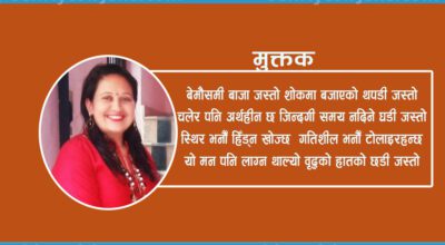 -लक्ष्मी ढकाल (१) बेमौसमी बाजा जस्तो शोकमा बजाएको थपडी जस्तो चलेर पनि अर्थहीन छ जिन्दगी समय नदिने घडी जस्तो स्थिर भनौँ हिँड्न खोज्छ गतिशील भनौँ टोलाइरहन्छ यो मन पनि