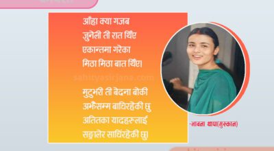 -भावना थापा(मुस्कान) मुसुक्क मुस्कुराएर हेरेका छड्के नजरहरु तिमी तिरै डुलाउन्थे यी मनका सारा रहरहरु। साउने झरी जस्तै उर्लिएका यौवनका तरङ्ग पिरतीको छाता ओढी म भिज्ने गर्थे तिमीसँग। आँहा क्या गजब