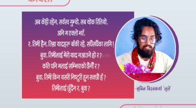-सुबिन बिस्वकर्मा बुवा, हामी फेरि कहिले भेट्छौ ? जब आकाश रुन्छ, पानीका थोपाहरू भुईँमा खस्छन्, प्रत्येक थोपाहरू गन्दै हाम्रो भेट हुने दिनहरू सम्झिन्छु, जब एक्लो महसुस गर्छु, सुइया गहिरो श्वास