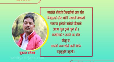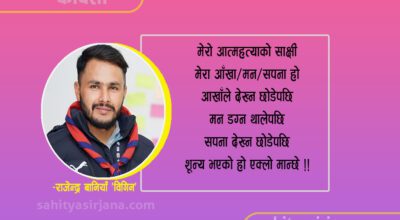 -राजेन्द्र बानियाँ ‘विगिन’ मेरो आत्महत्याको साक्षी यो समाज हो जसले बक पत्र पढेको थियोे मेरा विरुद्ध कुनै बेला !! मेरो आत्महत्याको सारथी यो प्रकृति हो जसले मेरो औचित्य बुझेन मेरो
