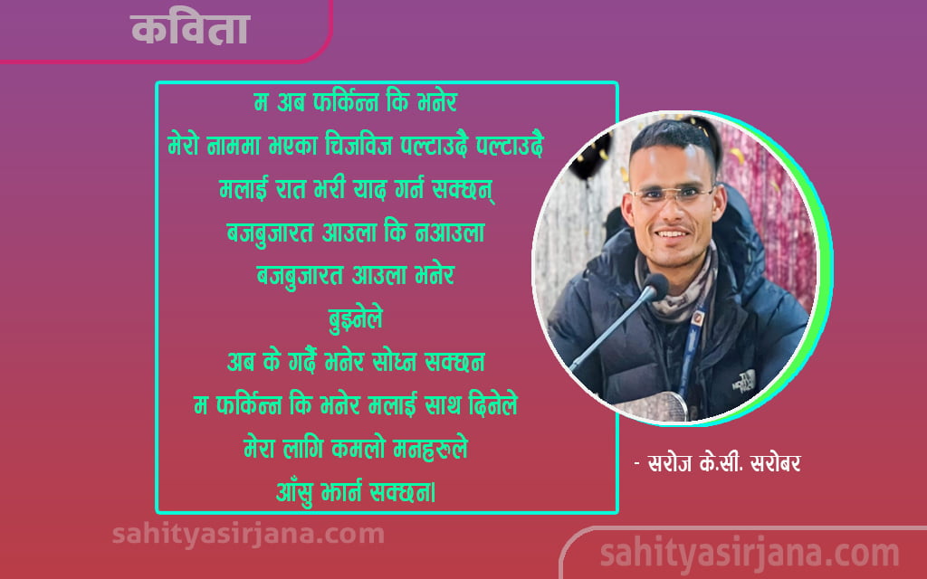 – सरोज के.सी. सरोबर कुनै पदको कुनै एउटा कार्यालयको कुनै एउटा ढाँड दुख्ने कुर्सि खाली होला या सधैँ म देखि रिसाउने कर्मचारी साथि खुसि होला यस्तै यस्तै होला मैले जागिर छोडेको