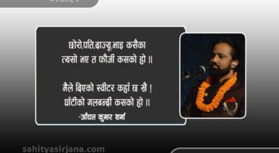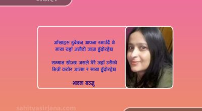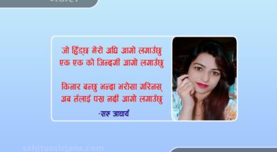 -सृजना’श्री’ नयनले लठ्यायौ नयनलाई मात्र भयो भूल थाहा छ मनलाई मात्र मुहारको सौन्दर्य सबथोक मान्यौ गर्यौ प्रेम आखिर वदनलाई मात्र हिया दुख्छ सागर तिमीलाई देख्दा फिँजायौ अँगालो गगनलाई मात्र बुझाउँ