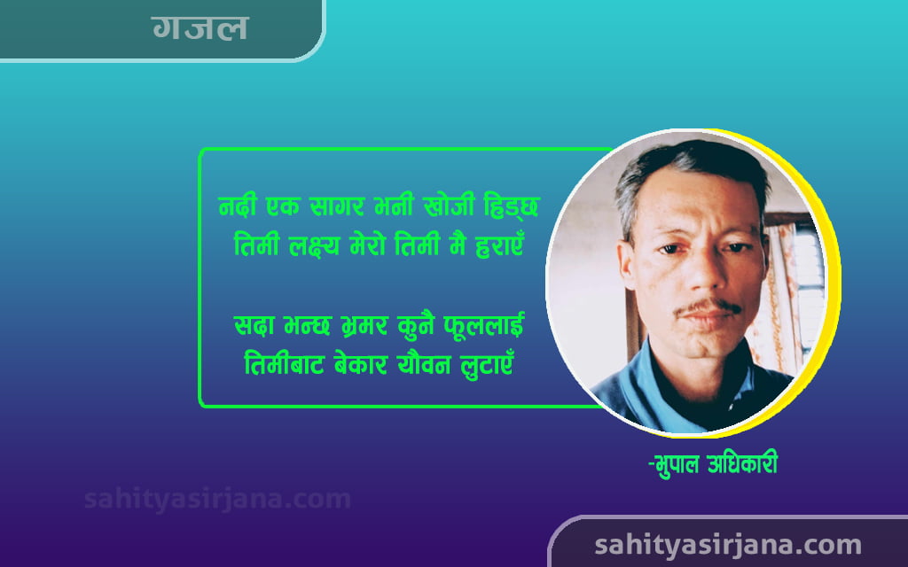 -भुपाल अधिकारी त्यही मर्न नै सक्छु जलमा डुबाएँ नुहाऊ भनी प्रेम गंगा बगाएँ नदी एक सागर भनी खोजी हिड्छ तिमी लक्ष्य मेरो तिमी मै हराएँ सदा भन्छ भ्रमर कुनै फूललाई
