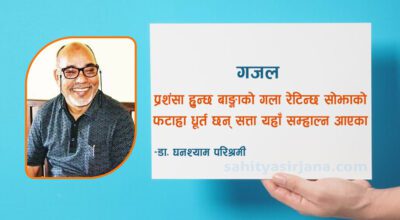 डा. घनश्याम परिश्रमी छन् उफ्रेका कुवाभित्रै कुवाकै गीत गाएका कुवाका भ्यागुता हेर्नुस् कुवामै छन् रमाएका कतै रङ्गीन जीवनकाे खुसी फैलिन्छ बास्नाझैँ कतै बस्तीहरूमा छन् यहाँ मान्छे डराएका यहाँ सत्पात्रकाे इज्जत