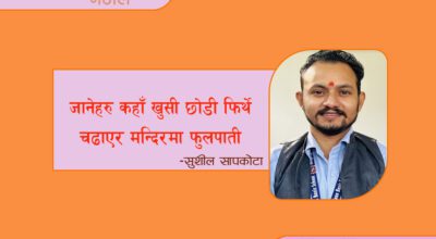 -सुशील सापकोटा बनेपनि तिम्रो नजरमा नजाती सँधै सम्झनाले पिरोल्ने भो छाती जानेहरु कहाँ खुसी छोडी फिर्थे चढाएर मन्दिरमा फुलपाती डुब्यो नाउसँगै चाहनाको चित्र रहर खेर गयो हुने दियो बाती सँधै
