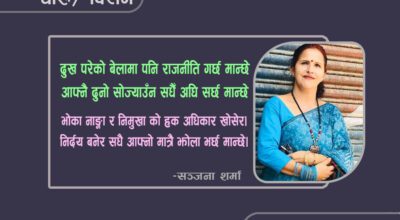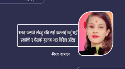 -रिता खराल कोरिरहेछु लेख कलमको मसी सकिन आँटेछ त्यतिबेलै आफन्तले घाउमा नुन भर्दिन आँटेछ साँच्चिकै दुश्मन हो कि आफन्त बुझ्न गाह्रो भयो कसैकसैले झूटा आरोप लगाई सम्झिन आँटेछ सहारा थियो