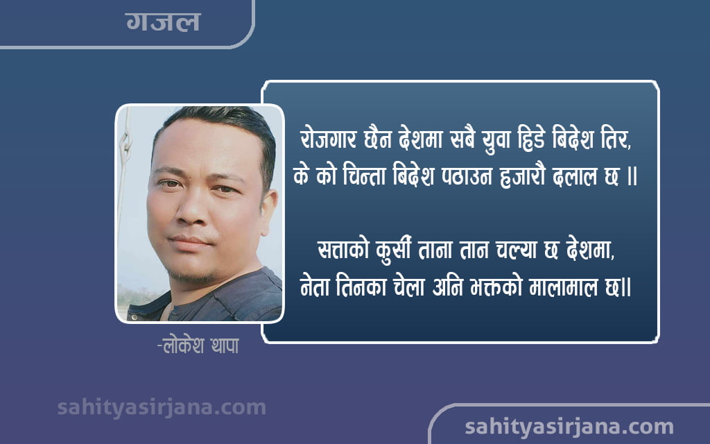 -लोकेश थापा हिमाल पहाड तराई नदी नाला खोला ताल छ, बुद्ध जन्मेको देशमा शान्तिको अनिकाल छ ।। चुनावमा के के गर्छु भन्थे हाम्रा नेता हरु, के भनौ र खै हाम्रो