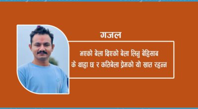 -प्रकाश शर्मा “आँसु” रात भारी तिमि सँग बात गर्न मन लाग्यो नसारूपी मदहोस् प्याला साथ भर्न मन लाग्यो हरेक प्याला नासा भित्र मादकताको लेबल बड्द दुरी अलि बढी छ की