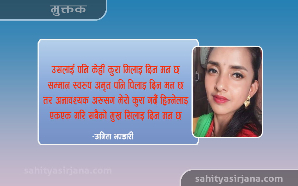 -अनिता भण्डारी मुक्तक १ जे आउछ्न भोग्नुपर्छ जिन्दगीमा आफ्नो रोजी हुदैन जीवन छउन्जेलसम्म कैले पनि कसैको खोजी हुदैन । हतारमा लास हेर्न आउनेहरुको भिड देख्छु यहाँ अनावश्यक लोभ किन गर्छौ