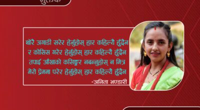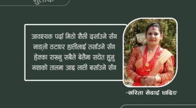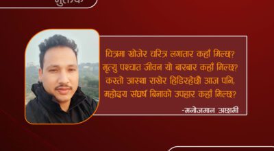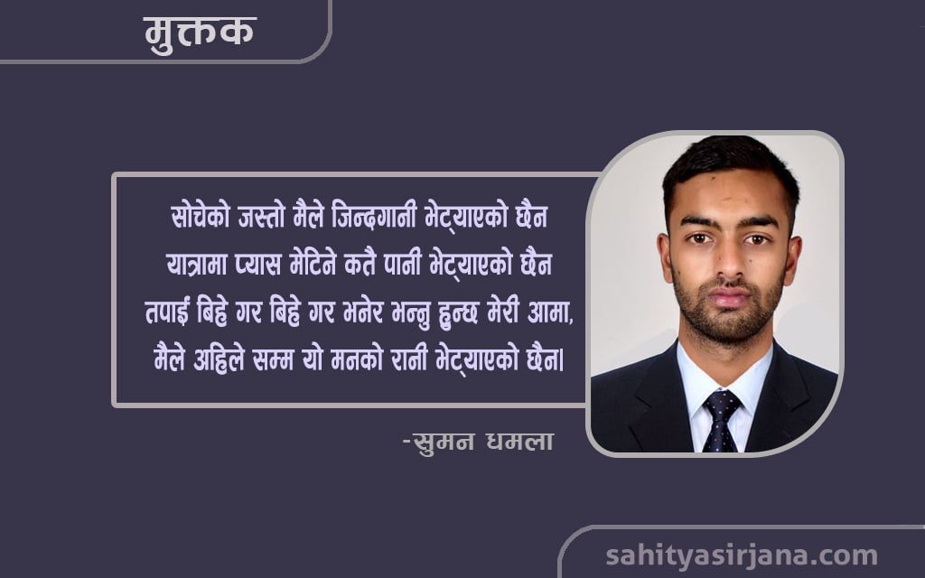 -मनोजमान अछामी (१) चित्रमा खोजेर चरित्र लगातार कहाँ मिल्छ? मृत्यु पश्चात जीवन यो बारबार कहाँ मिल्छ? कस्तो आस्था राखेर हिडिरहेछौ आज पनि, महोदय संघर्ष बिनाको उपहार कहाँ मिल्छ? (२) हिडेको