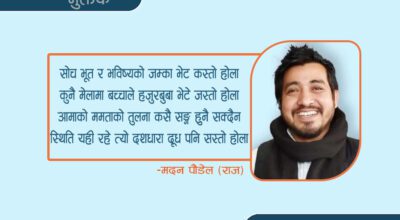 -मदन पौडेल (राज) (१) अथाह कथा बोकेर सगरमाथामा टेक्न मन छ आउने सयौँ पुस्ता पछिका मान्छे भेट्न मन छ थाहा छ मलाई, म हजारौँ वर्ष बाँच्न सक्दिन युगौँ बांचोस यस्तो