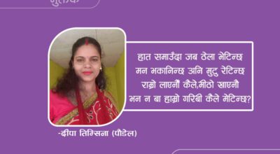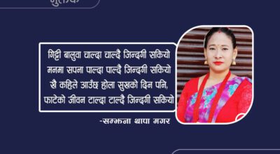-सम्झना थापा मगर (१) गिट्टी बालुवा चाल्दा चाल्दै जिन्दगी सकियो मनमा सपना पाल्दा पाल्दै जिन्दगी सकियो खै कहिले आउँछ होला सुखको दिन पनि, फाटेको जीवन टाल्दा टाल्दै जिन्दगी सकियो |