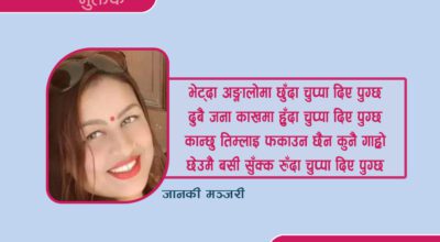 -जानकी मञ्जरी (१) तिमीलाई माया गर्न कुनै आधार चाहिन्न मात्र तिमी भए पुग्छ अरू संसार चाहिन्न मेरो मनको कुरा त्यो मनले सुटुक्क बुझ्नु बस् दुनियाँलाई सुनाउन कुनै प्रचार चाहिन्न (२)