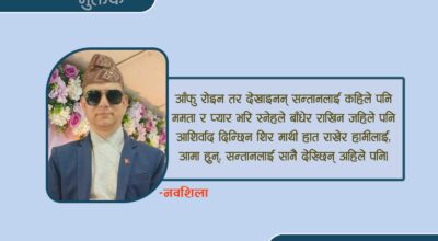 -नवशिला १ यो धर्ती आकास प्रकृति ब्रमाण्ड अनि चराचर हेर्नुस तपाई जन्मेको हुर्केको खेलेको रमाएको घर हेर्नुस यि सब देखिनुको कारण तिनै ममतामयि आमा हुन्, अब पालो तपाईको, तिनै आमाको