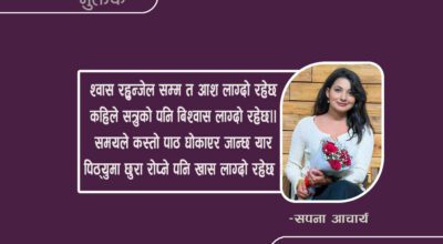 -सपना आचार्य १ श्वास रहुन्जेल सम्म त आश लाग्दो रहेछ कहिले सत्रुको पनि बिश्वास लाग्दो रहेछ।। समयले कस्तो पाठ घोकाएर जान्छ यार पिठ्युमा छुरा रोप्ने पनि खास लाग्दो रहेछ ।