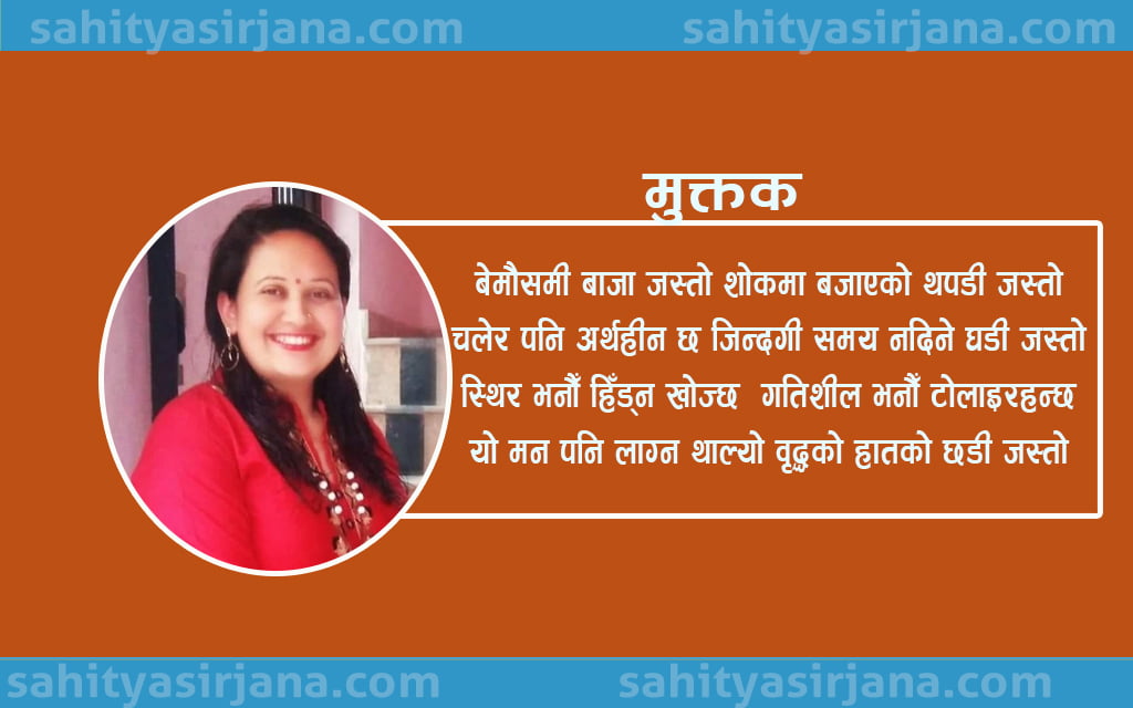 -लक्ष्मी ढकाल (१) बेमौसमी बाजा जस्तो शोकमा बजाएको थपडी जस्तो चलेर पनि अर्थहीन छ जिन्दगी समय नदिने घडी जस्तो स्थिर भनौँ हिँड्न खोज्छ गतिशील भनौँ टोलाइरहन्छ यो मन पनि