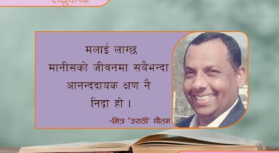 -मित्र ‛उराठी’ गौतम म झसङ्ग भएर व्यूझिएँ। ढोका खोलेको आवाजसँगै बाबा कोठाभित्र छिरीसक्नु भएको थियो। ‟हैन् निदाइसकिस् कि के हो ? आँखा त राताराता छन् नि।अझै गृहकार्य सकेको छैन् ?